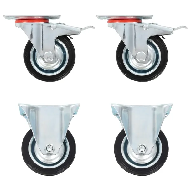 Kółka zostały wykonane z gumy, która wyróżnia się dobrą odpornością na wstrząsy i wibracje, co zapewnia płynną i cichą jazdę. Dodatkowo ich miękka powierzchnia skutecznie chroni podłogę przed zarysowaniem. Żelazna, ocynkowana rama jest wysoce odporna na rdzę, a tym samym zwiększa wytrzymałość i trwałość kółek. Połowa z nich została wyposażona w hamulce, ułatwiające elastyczne sterowanie. Każde z kółek ma maksymalną nośność do 50 kg.